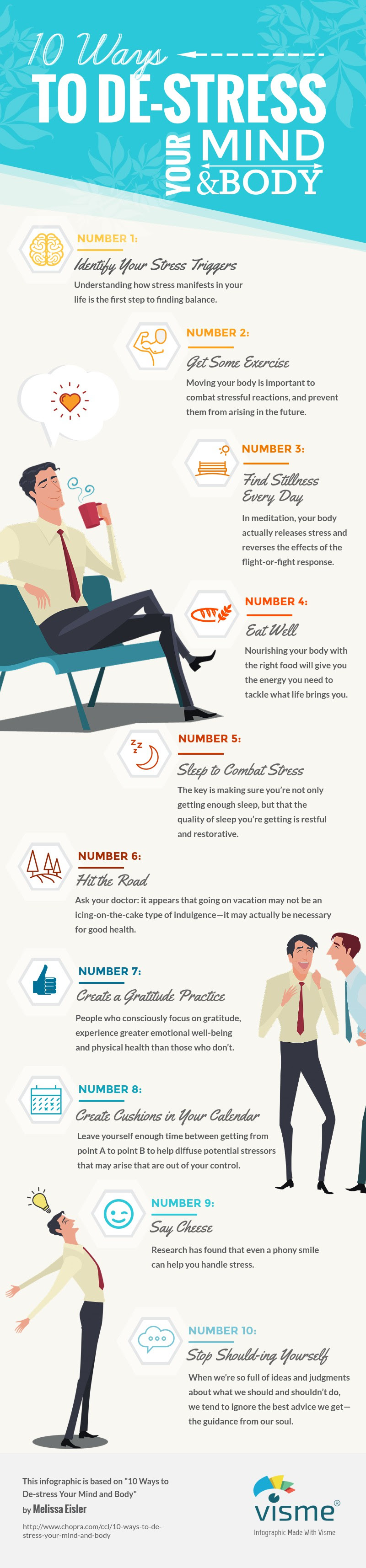 These are just a few of the essential tips you'll learn about in the following Infographic, appropriately titled "10 Ways to De-Stress Your Mind and Body." Created with Visme, it's an invaluable resource that you can use to not only remove stress from your day, but to cut it out of your life wherever you can. You need to understand that there is no magic bullet when it comes to defeating stress. It's not like you can flip a light switch and suddenly you'll be relaxed and calm 100% of the time. As with most things, it's often a series of small-yet-critical steps that, when taken together, add up to a pretty powerful whole.